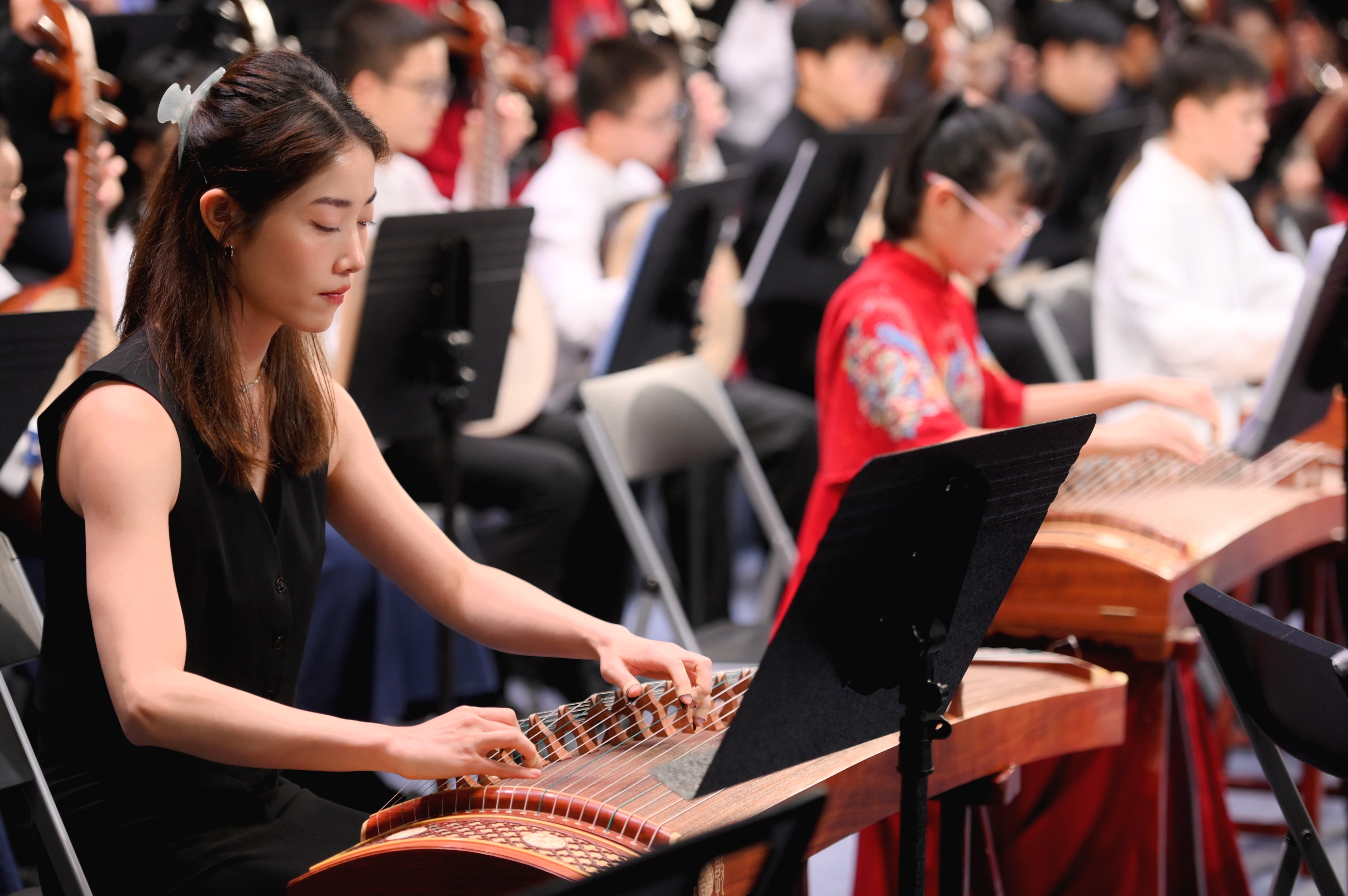 在著名指揮家李复斌教授及中山、深圳兩地青年指揮凌程、陳君杰的執棒下,中山市青少年民族樂團與深圳市寶安青少年宮民樂團、香港樂樂國樂團(特邀)、澳門風雅頌協會(特邀)的180餘名青少年樂手,為觀眾傾情演繹了《龍騰虎躍》、《日照香山》等多首國樂曲目。